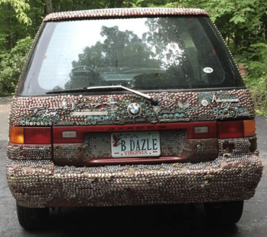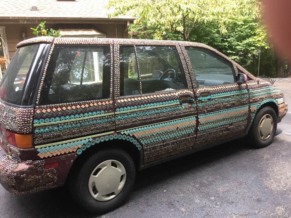 If you remember the bedazzled limo a reader found a few months back, you’ll notice that today’s Nissan is quite a bit more intricate in patterns/detail. Where the Limo dazzled with quantity, the Nissan B-Dazles with quality. Apparently it has taken over 6 years for the owner to get this Art Car to the state that it is in today.